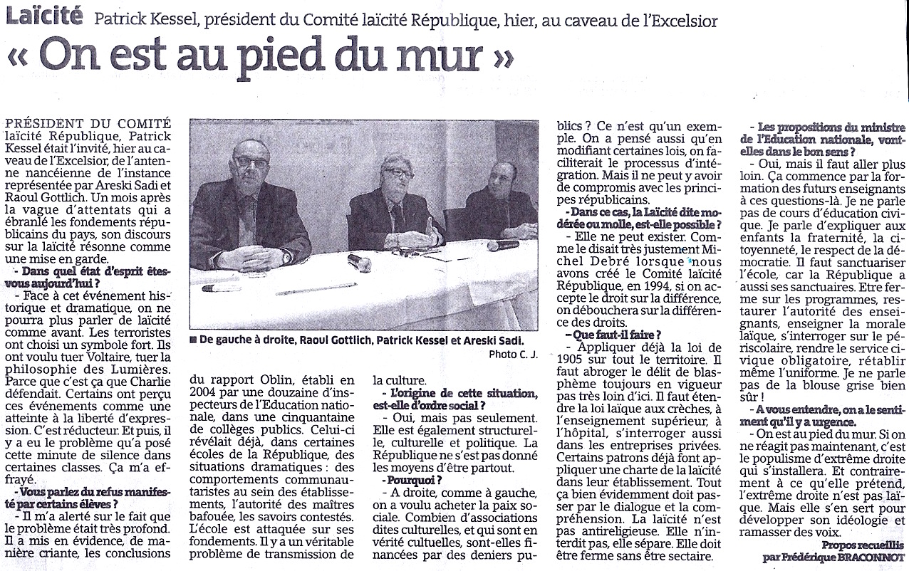 "Patrick Kessel, président du Comité laïcité République, hier, au caveau de l’Excelsior « On est au pied du mur »"